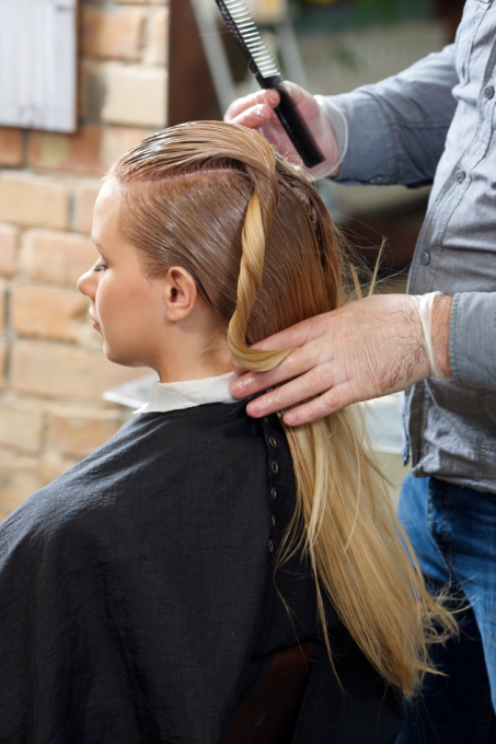 それからご自身のイメージ、好きな色などのご要望を聴きながらコーディネートいたします。根元の新生毛には頭皮を守る保護材をカラーに配合し、すでに染まっている既染毛には、髪を傷めるアルカリ剤の配合されていないカラー剤を使用します。また、その既染毛(きせんもう)にはサロンオリジナルの髪の栄養補給をしています。